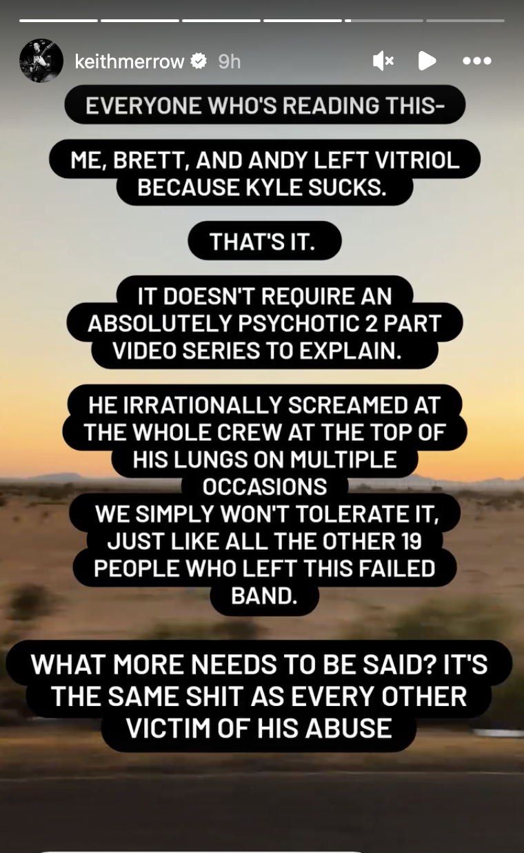 “Everyone who’s reading this; me, Brett, and Andy left Vitriol because Kyle sucks. That’s it. It doesn’t require an absolutely psychotic 2 part video series to explain. He irrationally screamed at the whole crew at the top of his lungs on multiple occasions,” he continued. “We simply won’t tolerate it, just like all the other 19 people who left his failed band. What more needs to be said? It’s the same sh*t as every other victim of his abuse.”
