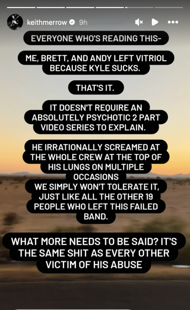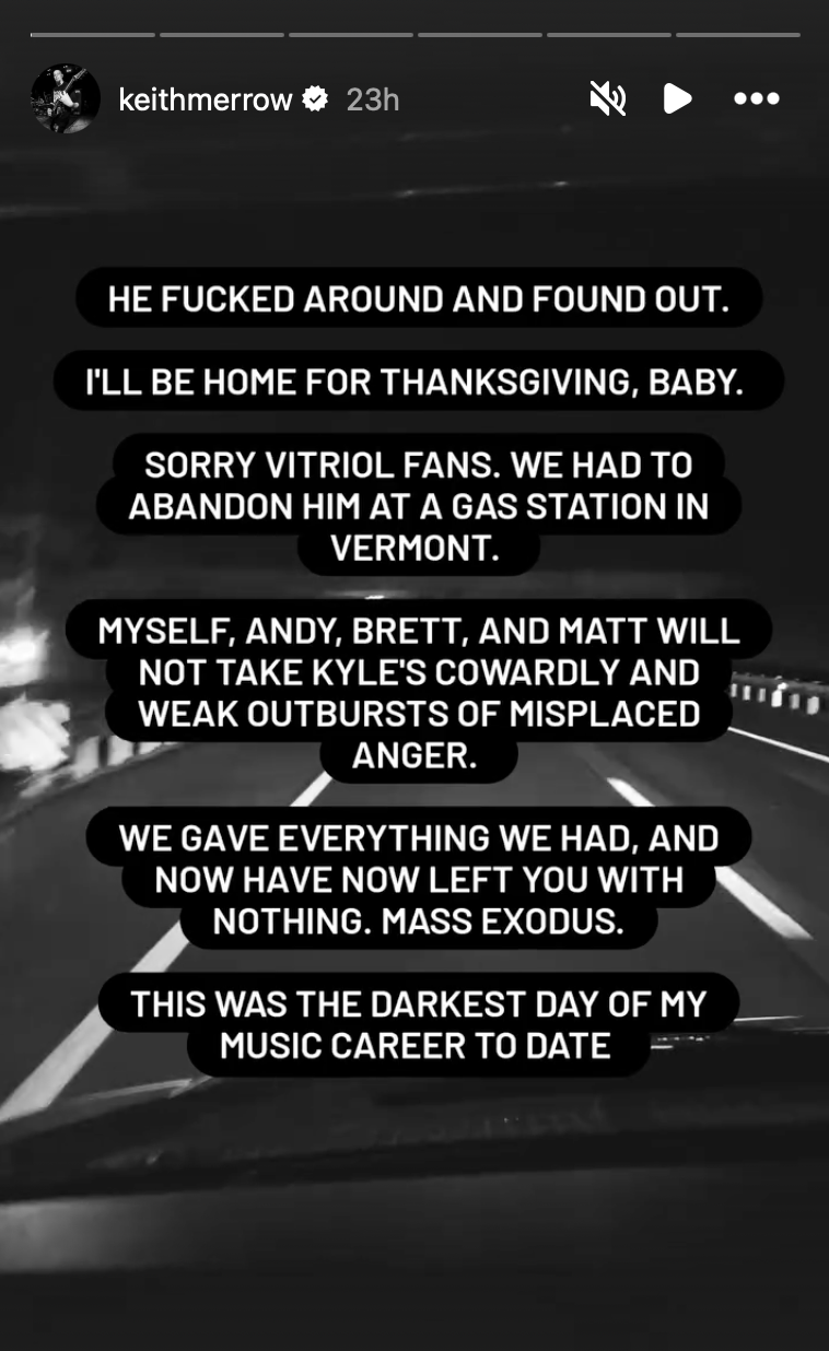 “He f*cked around and found out. I’ll be home for thanksgiving, baby. Sorry Vitriol fans. We had to abandon him at a gas station in Vermont,” Merrow wrote. “Myself, Andy, Brett, and Matt will not take Kyle’s cowardly and weak outbursts of misplaced anger. We gave everything we had, and now have now left you with nothing. Mass exodus. This was the darkest day of my music career to date.”