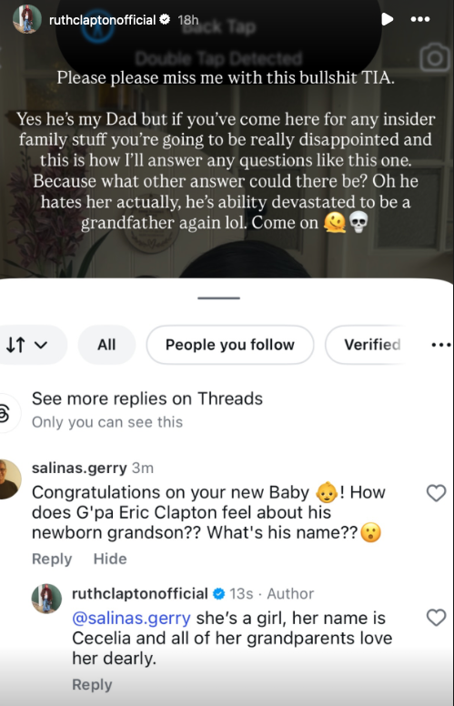 “She’s a girl, her name is Cecelia and all of her grandparents love her dearly,” Eric Clapton’s daughter Ruth Clapton responded.