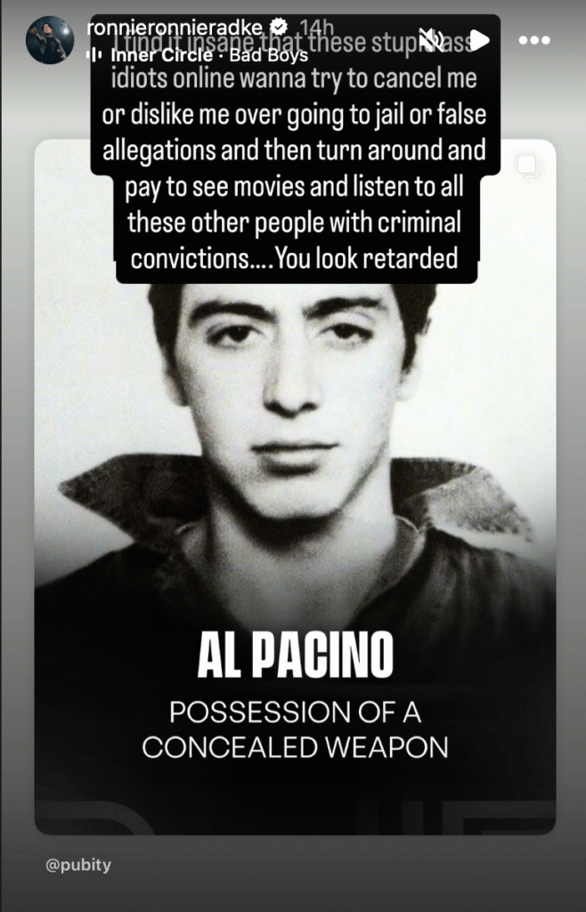 “I find it insane that these stupid ass idiots online wanna try to cancel me or dislike me over going to jail or false allegations and then turn around and pay to see movies and listen to all these other people with criminal convictions,” Radke said. “You look retarded.”