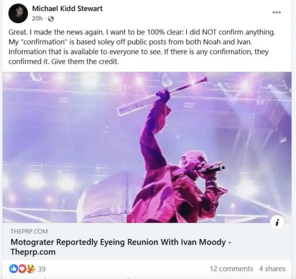 Former Motograter member Michael ‘The Kidd’ Stewart recently issued a clarification regarding rumors about Ivan Moody’s potential reunion with the band. He addressed the speculation in a statement shared on Facebook.