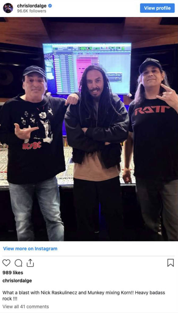 “What a blast with Nick Raskulinecz and Munkey mixing Korn!!” Chris Lord-Alge said. “Heavy badass rock!!!”