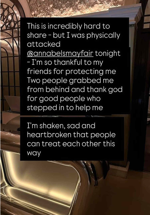 “This is incredibly hard to share – but I was physically attacked at Annabel’s at Mayfair tonight,” she said. “I’m so thankful to my friends for protecting me.”