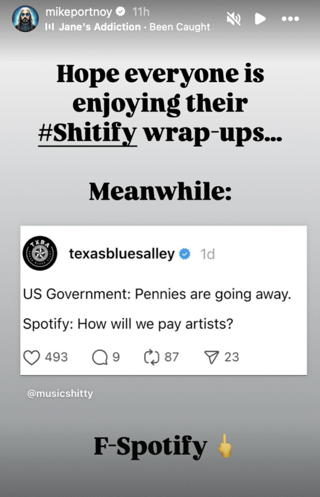 “Hope everyone is enjoying their ‘Shitify’ wrap-ups,” Portnoy said. “Meanwhile: ‘US Government: Pennies are going away. Spotify: How will we pay artists?’ F-Spotify!”