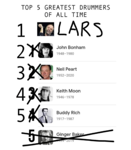 “There. Fixed it,” Hoffman wrote in his caption, placing Lars Ulrich at the top of the list and removing Ginger Baker from the fifth position. He added a disclaimer to clarify his intent: “It’s just a joke. I know Lars can spark quite a bit of controversy in the drumming community.”