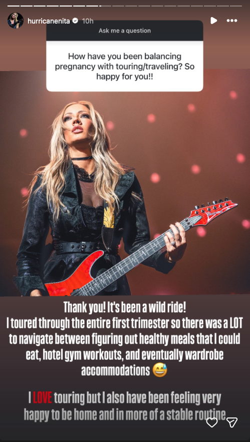 Alice Cooper guitarist Nita Strauss recently opened up about balancing her pregnancy with her touring career, sharing insights about how motherhood might influence her future plans. The guitarist addressed fan questions during a Q&A session on Instagram.