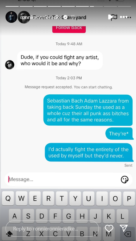 “Sebastian Bach, Adam Lazzara from Taking Back Sunday [and] The Used as a whole cuz they’re all punk ass bitches and all for the same reasons,” his response read, referring to the past feuds Radke has with both. “I’d actually fight the entirety of the used by myself but they’d never.”
