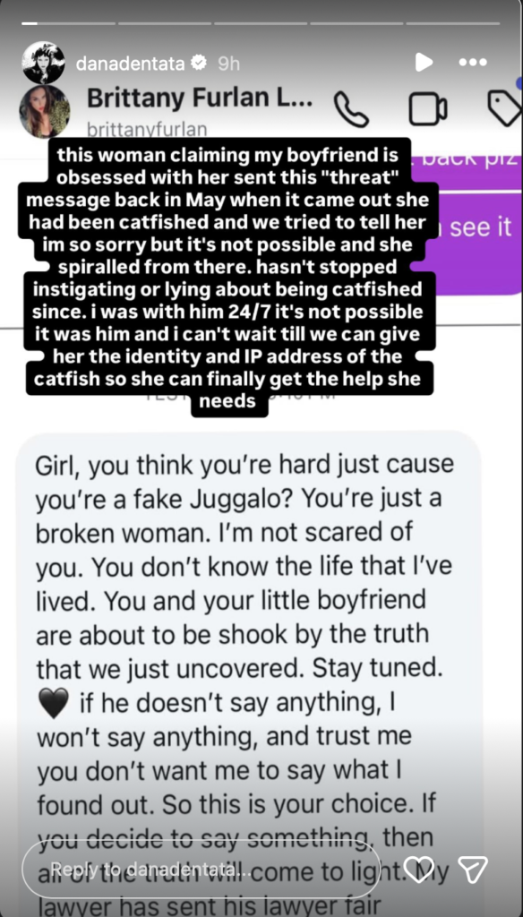 The message from Brittany Furlan that Dentata shared contained direct threats and accusations.