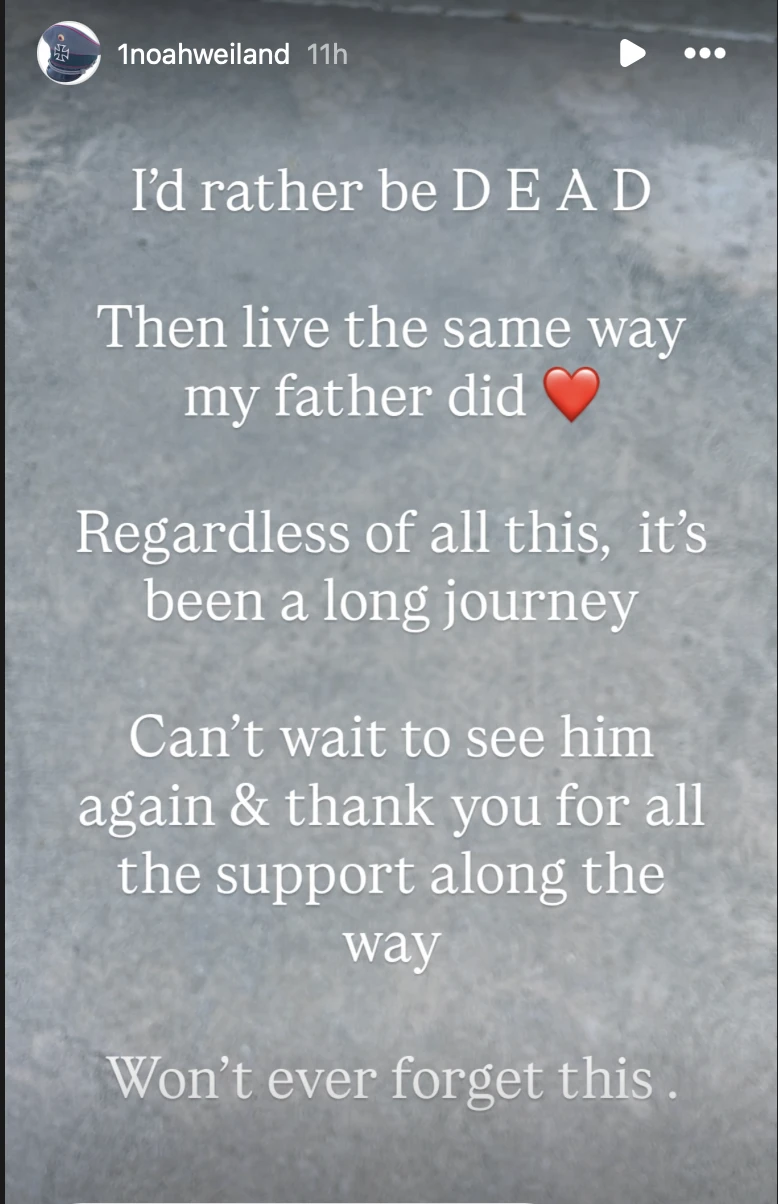 “I’d rather be dead than live the same way my father did,” he continued. “Regardless of all this, it’s been a long journey. Can’t wait to see him again and thank you for all the support along the way. Won’t ever forget this.”