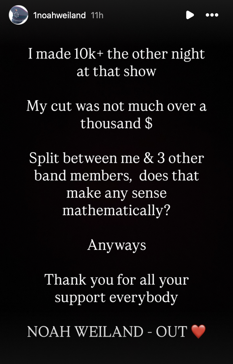 “I made 10K+ the other night at that show,” Noah said. “My cut was not much over a thousand dollars. Split between me and 3 other band members, does that make any sense mathematically?”