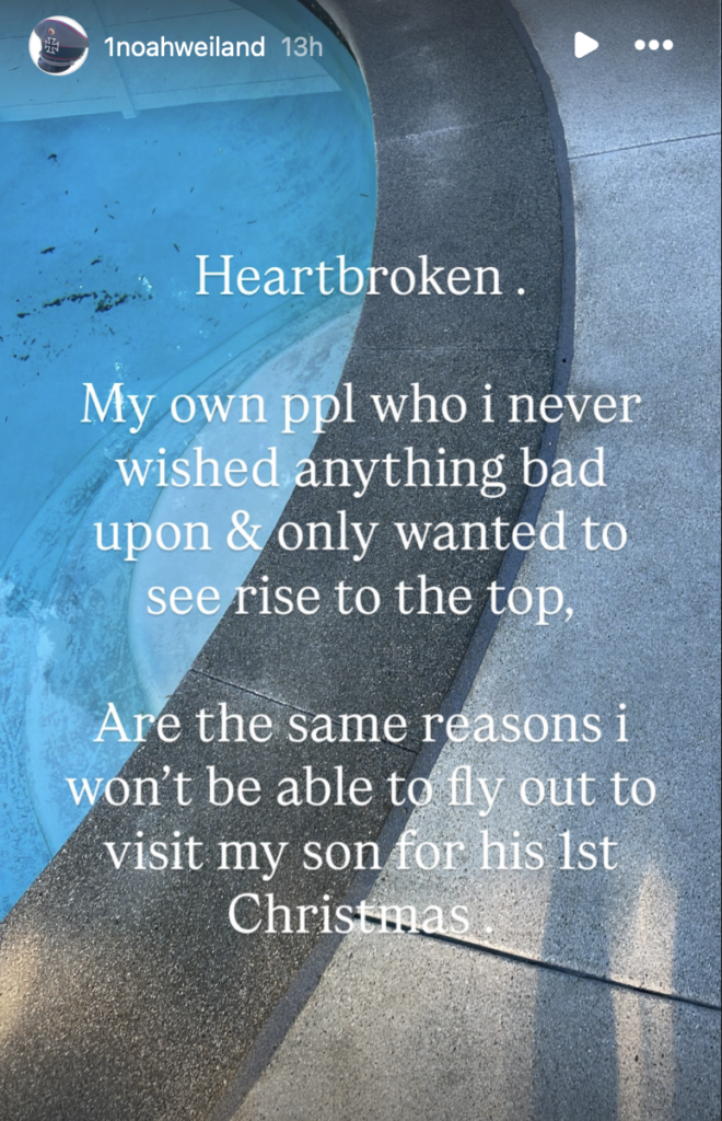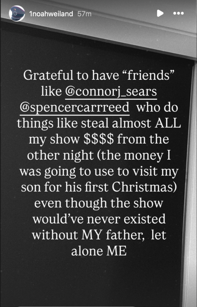 “Heartbroken. My own people, who I never wished anything bad upon and only wanted to see rise to the top, are the same reasons I won’t be able to fly out to visit my son for his 1st Christmas,” he said. “Grateful to have ‘friends’ like Connor James Sears and Spencer Carr Reed, who do things like steal almost ALL my show money from the other night (the money I was going to use to visit my son for his first Christmas).”