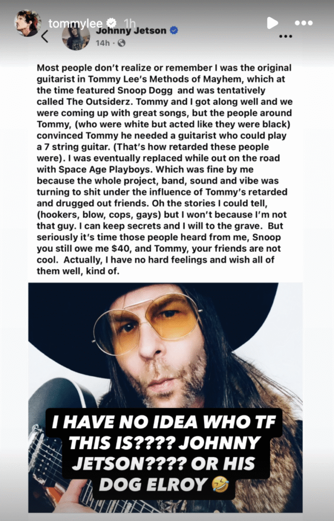 Tommy Lee’s response to the claims was dismissive. “I have no idea who TF this is?? Johnny Jetson?? Or his dog Elroy,” Lee replied.