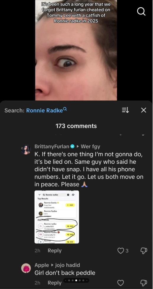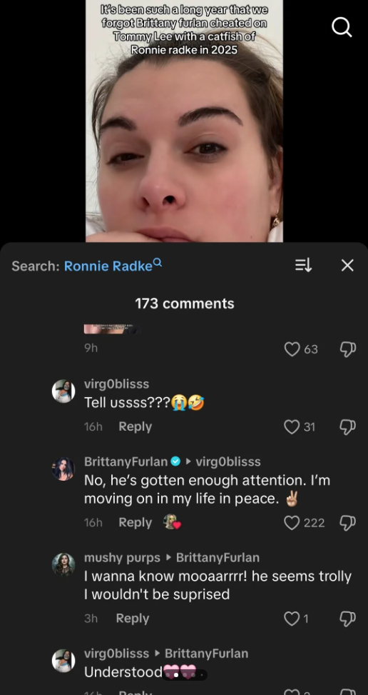 “If you only knew the truth…No, he’s gotten enough attention,” Furlan commented on the TikTok video. “I’m moving on in my life in peace.”