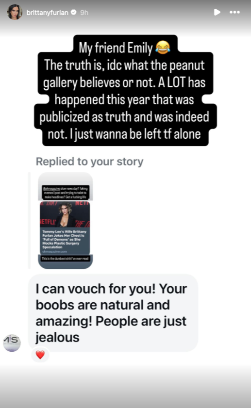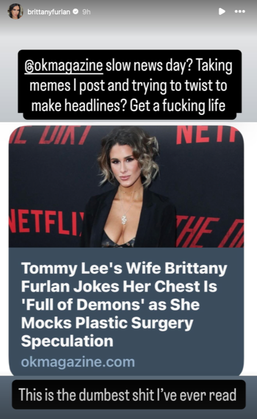 “And the headline is, ‘Tommy Lee’s Wife Brittany Furlan Jokes Her Chest Is Full of Demons as She Mocks Plastic Surgery Speculation.’ Slow news day? Taking memes I post and trying to twist them to make headlines? Get a f*cking life. This is the dumbest sh*t I’ve ever read,” she continued.