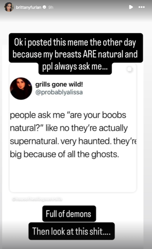“Ok, I posted this meme the other day because my breasts are natural and people always ask me,” she said. The meme says, “People ask me, are your boobs natural? Like no, they’re actually supernatural. Very haunted. They’re big because of all the ghosts.”